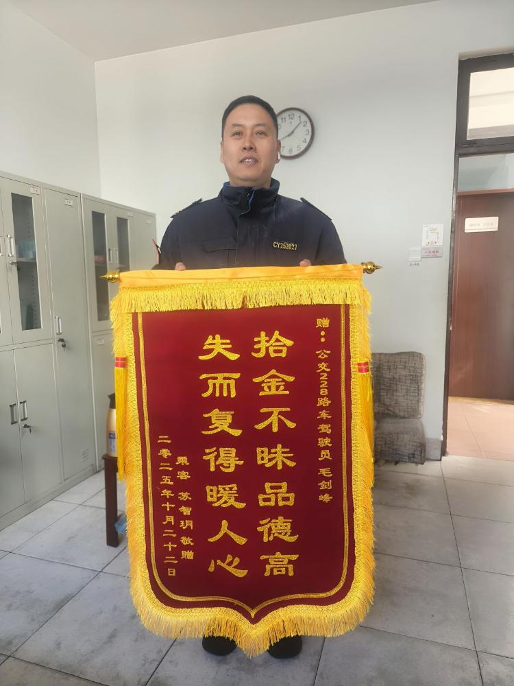 巧合的是,就在失物被送至分公司的同时,心急如焚的失主苏女士也赶到了场站。经工作人员仔细核对身份信息与包内物品,香奈儿包及重要证件均完好无损。苏女士激动地连连道谢:“这些证件补办起来非常麻烦,差点影响了我的出国行程,如果没有你们,我真不知该如何应对!”苏女士表示,这不仅帮她挽回了重大损失,更让她感受到了青岛巴士的暖心服务。次日上午,苏女士特意在站点等待,委托228路驾驶员将一面写有“拾金不昧品德高 失而复得暖人心”的锦旗转交毛剑峰,再次表示谢意。